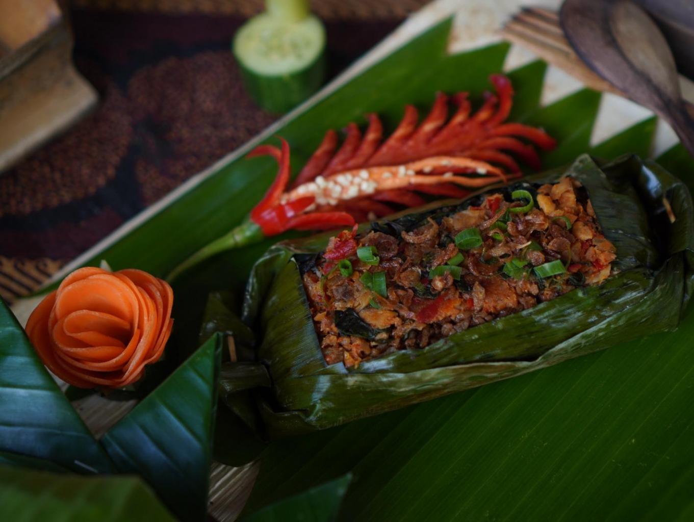 Wisatawan menikmati makanan khas desa seperti nasi thiwul, nasi putih, kare ikan lumedanh/blencing, urap, sayur pakis, sayur lompong, kothok kemangi tahu tempe, gembrot (bothok beluntas), kerupuk, kolak kaling kaling, sop durian, dan snack khas desa.