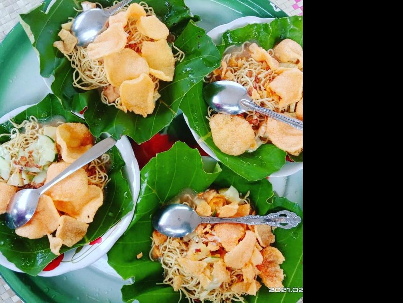Mie Rebus Belitung ini kalau di Desa Wisata Kreatif Terong ada dua warung yang menjualnya secara rutin setiap hari. Dan dua-duanya punya usaha masyarakat lokal. Yang membuat Mie Rebus Belitung ini peunya kekhasan tersendiri karena disajikan di atas piring yang dilapisi Daun Simpor yang menimbulkan aroma unik, ditambah lagi dengan kuahnya yang mengandung kaldu udang lokal makin membuat wangi dan gurih rasanya. Biasanya selama ini kalau ada tamu/wisatawan yang berkunjung dan menginap di homestay pasti akan dibawa dulu ke salah satu warung tradisional untuk menikmati Mie Rebus Belitung ini sebagai tanda perkenalan baru masuk Desa Wisata Kreatif Teong. Bahan-bahan lainnya yang dicampurkan dalam sajian Mie Rebus Belitung ini adalah rebus kentang, potongan tahu goreng yang dipotong dadu kecil dan pakai emping atau kerupuk. Satu porsinya sudah lebih dari cukup untuk membuat kenyang perut, apalagi jika ditambahkan satu butir telur ayam rebus akan menambah selera makannya.